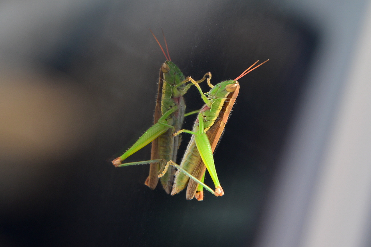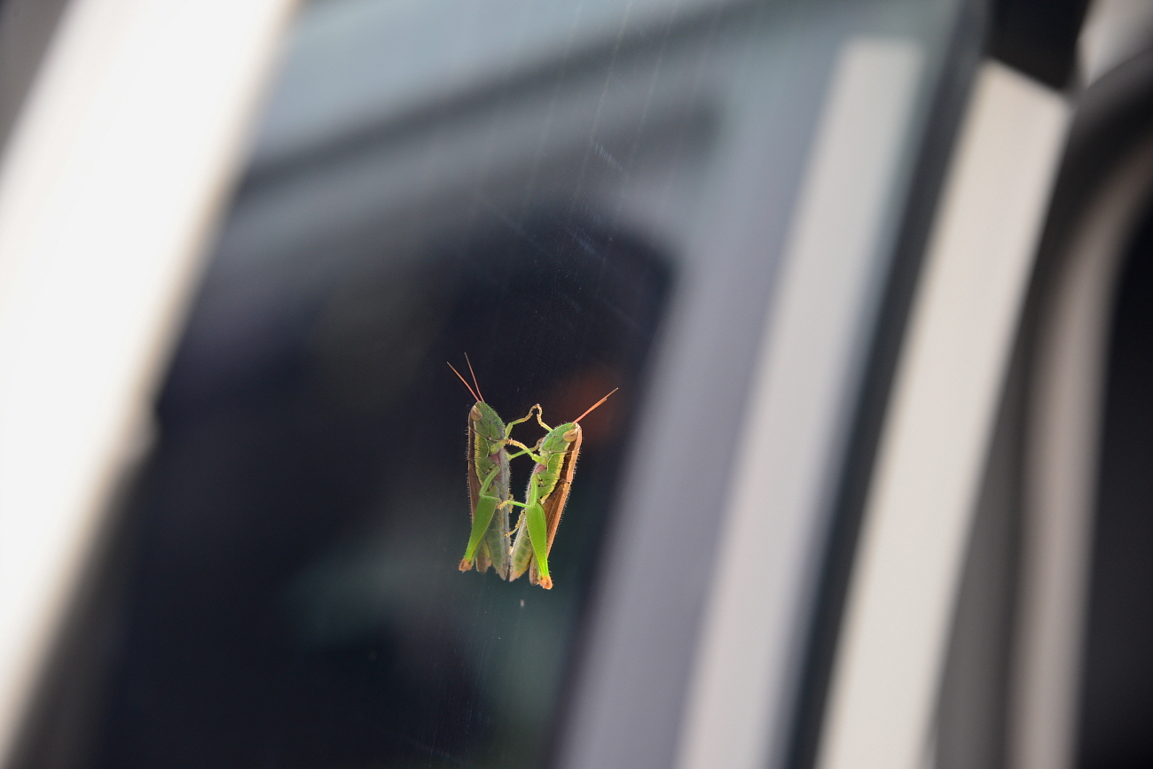 자동차 유리에 붙은 메뚜기